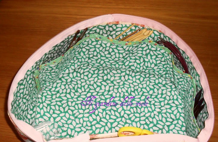 Iniziando a cucire piccoli pezzi di stoffa e assemblando vari blocchi è nato un capiente contenitore, munito di tasche e di accessori utili per ogni lavoro.